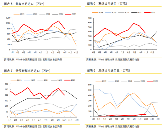 进口方面来看,往年12月份焦煤进口也多呈现季节性回落的态势 。从1-10月份整体进口情况来看,其中进口蒙煤及俄罗斯煤占全部进口80%左右,而1-10月份进口蒙古炼煤4139.6万吨,月均进口413万吨,而蒙古国财政部国务秘书兼ETT全权代表吉·钢巴图下半年表示,根据今年的预算修正案,批准出口5000万吨煤炭。目前,蒙古已出口4670万吨煤炭。因此11月至12月预计出口量将近500万吨,而焦煤在整个出口中占比近80%,因此预计11-12月进口蒙煤量月均200多万吨,环比10月份及年内平均水平将大幅降低。而进口俄罗斯煤来看,年内整体波动相对平稳,从季节性来看,您内进口俄罗斯煤的高点多在前三季度出现,因此乐观预期11-12月均进口俄罗斯煤于前三季度相等,整体进口量相对偏稳。