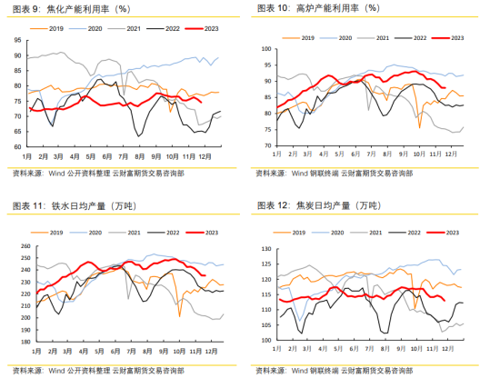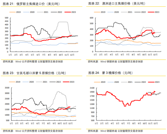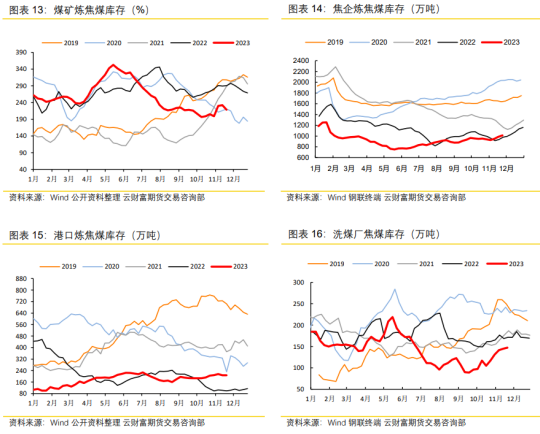 从库存的分布情况来看,当前焦煤上游库存整体处于近五年同期低位。而中游及下游库存处于近五年同期次低位,整体高于去年同期水平。而从库存的季节性表现来看,年末中游及下游库存整体呈现不断回升的态势,而洗煤厂及煤矿库存多处于回落态势,整体库存资源在年末呈现明显向下游不断转移的过程,即下游的补库需求预计相对偏强。从对于上游来说,当前低库存态势,有利于增强上游对焦煤的定价权,从而对焦煤价格形成较强支撑。
