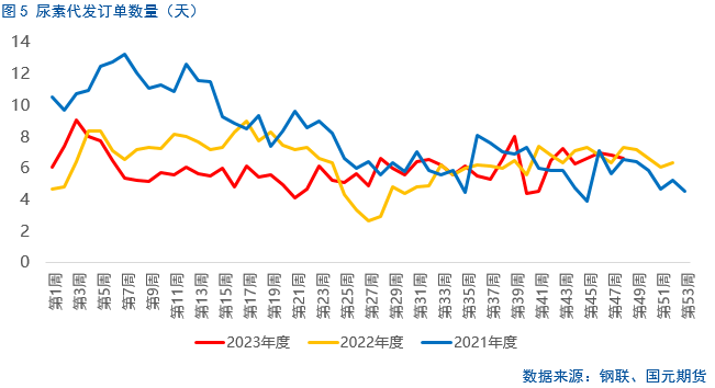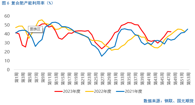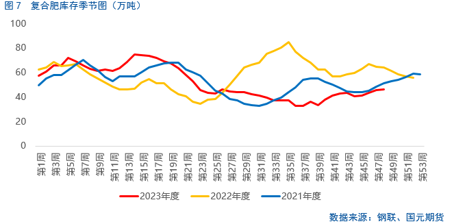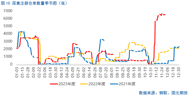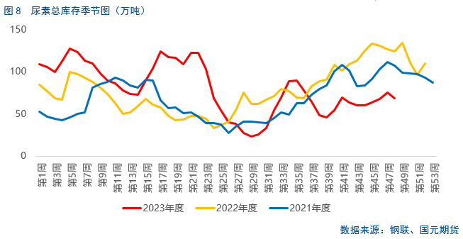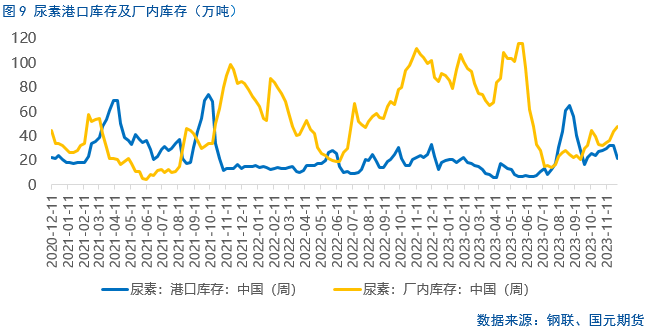 中游方面,市场对高价尿素接受度不高,成交以偏低价格为主,买卖双方相对僵持,上周主流预收天数小幅下降。截至11月29日,中国尿素企业预收订单天数6.59日,较前一周减少0.23日,环比减少3.37%。下游复合肥方面,季节性开工高峰到来,复合肥企业库存居于近三年低位,对尿素需求延续旺盛。截至2023年12月1日,山东临沂复合肥样本生产企业尿素需求量2300吨,较前一周周增加550吨,环比涨31.43%。
