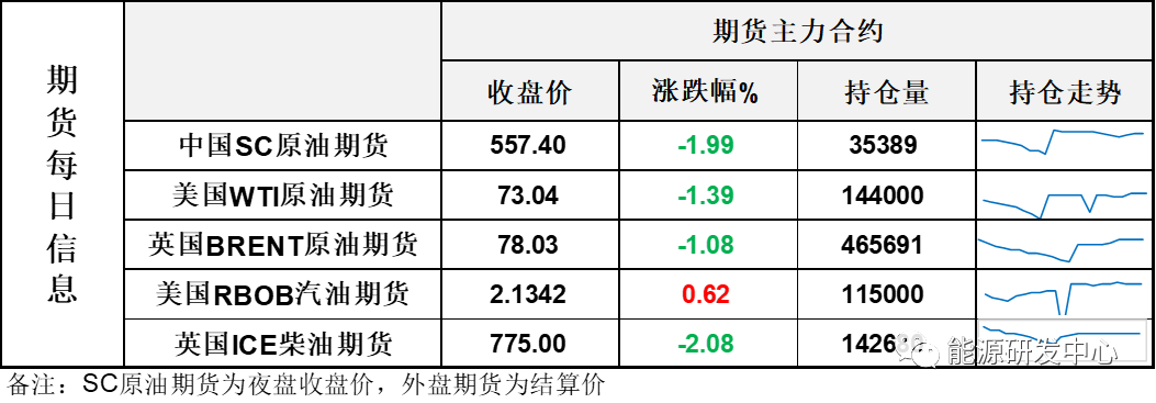 【1】WTI主力原油期货收跌1.03美元,跌幅1.39%,报73.04美元/桶;布伦特主力原油期货收跌0.85美元,跌幅1.08%,报78.03美元/桶;INE原油期货收跌1.99%,报557.4元。