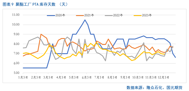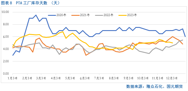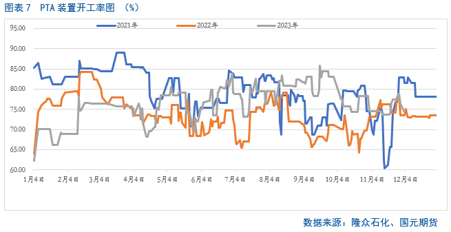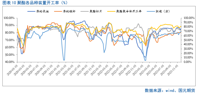 从库存来看,11月末PTA工厂库存在5.02天,较上周下滑0.12天,较同期增加0.50 天;主要是下游刚需支撑,有工厂存在超卖。聚酯工厂PTA原料库存达到6.94 天,较上周下滑0.06 天,较同期增加0.22 天。主要是基本面驱动不足,原料供应宽松,工厂补货刚需为主,整体交易难增量。从下周PTA市场的装置变化来看,逸盛大化计划降负,福化计划提负,四川能投、汉邦石化计划重启,已减停装置或延续检修,整体开工将维持在76%左右,和上周变化不大。