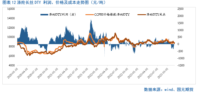 近期下游聚酯综合装置开工率回升,市场存在边际改善。截至11月30日,国内聚酯综合开工率在88.56%,较前一周上涨0.46个百分点,主要是涤纶长丝装置开工率上涨从而推动整个聚酯综合装置开工率微涨。截至发稿,涤纶长丝装置开工率达到85.49%,较前一周上涨1.22个百分点,打破了聚酯装置开工持续收缩的局面。由于近期产业链利润向下游聚酯转移,下游聚酯市场各品种利润都呈现不同幅度的修复,尤其是涤纶长丝各品种目前都由亏损状态转为盈利模式。结合聚酯市场供需基本面,以及利润来看,短期对于上游PTA市场存在一定的正反馈。从后期来看,虽有部分聚酯装置计划检修,但新产能投放后聚酯负荷存在提升的预期,因此预计下周聚酯市场整体供应将较本周小幅增加,对上游PTA市场仍然存在一定的利好指引。考虑到终端纺织业装置开工暂无较大变化,而且12 月下旬后,下游多开始考虑减产,预计后期行业开机多数偏弱维持为主。