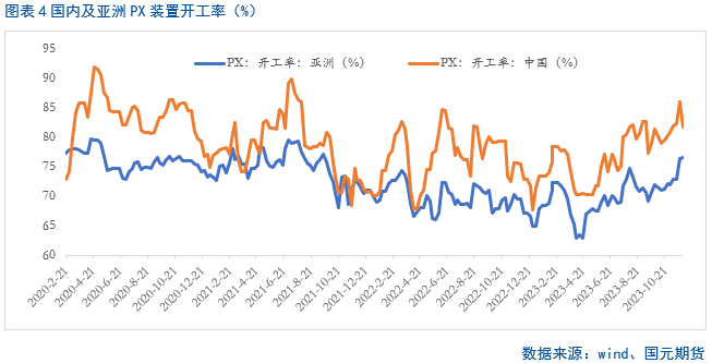 近期随着浙石化前期停车检修的装置故障问题解决,装置负荷的提升,叠加富海一套装置负荷提升,一套装置停车检修,国内PX装置开工率持续微涨,市场供应增加。据统计,截至11月30日,PX装置开工率达到82.38%,较前周上涨0.45个百分点,达到自9月初以来的新高。