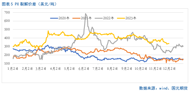 本周国内PX产量为68.6万吨,较上周下滑3.49万吨,降幅达到4.84%。主要是上周盛虹400万吨/年的装置因故障于11月26日降负至5成,28日升温,月底恢复正常运行,叠加大连福佳140万吨的装置于11月24日附近检修,至12月1日才投料,导致上周国内PX装置开工率呈现明显的回落。据统计,截至上周四,国内PX装置开工率较前一周下滑4.16个百分点至81.8%。反观外围市场,由于韩国GS55万吨PX装置8月初检修,11月22日重启。由于国内装置开工率骤降,而韩国装置开工率略有提升,导致亚洲综合开开了较前一周变化不大。而在近期原油持续回调的背景下,PX裂解价差持续走弱,产业链利润向聚酯装置转移。截至12月1日,PX裂解价差至335.5美元/吨。从后期来看,随着大连福佳140万吨的装置,后期供给端将持续回升,对PTA的支撑相对有限。