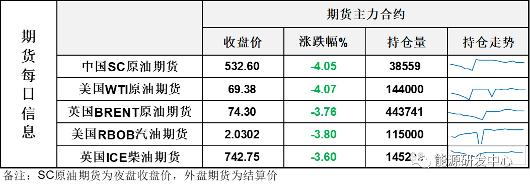 【1】WTI主力原油期货收跌2.94美元,跌幅4.07%,报69.38美元/桶;布伦特主力原油期货收跌2.9美元,跌幅3.76%,报74.3美元/桶;INE原油期货收跌4.05%,报532.6元。