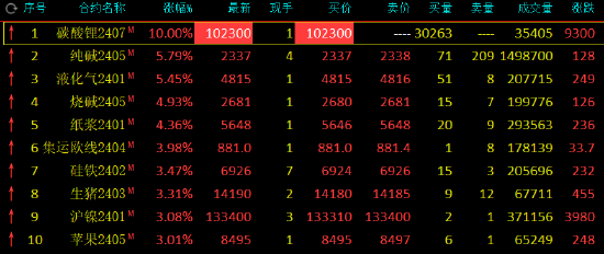早盘收盘,国内期货主力合约多数上涨,碳酸锂封涨停板,涨幅10%,纯碱、液化石油气(LPG)涨超5%,烧碱涨近5%。跌幅方面,尿素跌超2%,低硫燃料油(LU)、玻璃跌超1%。