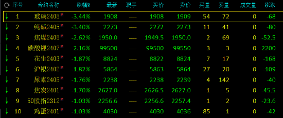 早盘收盘,国内期货主力合约涨跌互现。液化石油气(LPG)、纸浆涨超2%,低硫燃料油(LU)、SC原油、菜粕、集运指数涨超1%。跌幅方面,玻璃、纯碱跌超3%,焦煤、碳酸锂跌超2%,沪银、花生、焦炭、尿素跌超1%。