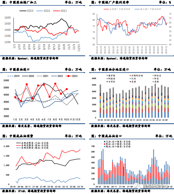 中国是全球第一大原油进口国,也是仅次于美国的第二大消费国。今年的需求表现中,原油加工需求保持高位,中东进口份额下降明显:随着年初以来中国放开疫情管控,国内制造业PMI逐渐好转,推动油品需求在经济复苏下恢复上行,进口量和加工量均维持在疫情以来的高位水平。海关数据显示,今年,1-10月中国原油炼厂加工累计为61876万吨,同比增长11.2%;原油进口累计为47322万吨,同比增长14.4%。其中8月份进口量达到5280.4万吨,创历史第三高月度原油进口记录。而进口来源中,俄罗斯取代沙特成为第一大供应来源。1-10月自沙特累计进口7338.8万吨(占比16%),同比下跌1%;自俄罗斯累计进口8849.2万吨(占比19%),同比增长23%。值得注意的是,1-10月自巴西进口同比增幅超过60%(占比7%);美国进口同比增幅达到96%(占比3%,疫情前仅1%)。长期以来,中国一直依赖中东地区的石油供应,今年OPEC+减产和巴以冲突地缘政治对中国能源供应链产生较大影响,考虑到油价波动和成本波动,中国对多元化进口和能源供应稳定的需求逐渐提升。