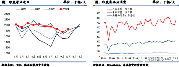 印度是世界第三大石油进口国和消费国,其将近500万桶/天的原油需求中,有85%以上依靠进口。今年的需求表现中,炼厂加工水平相对较高,汽柴煤消费需求稳定增加。1-10月印度炼厂原油加工量累计2.2亿吨,同比去年同期2.1亿吨上升5%,尽管受6-9月印度季风季影响燃油消耗需求,但仍维持在相对高位水平。其中汽油/柴油/煤油消费需求分别累计3.0/7.4/0.59亿吨,同比去年同期2.8/6.9/0.56亿吨分别增加7%/7%/5%。由于印度经济增长速度快于预期,且制造业活动相对强劲,对国内油品需求拉升明显。今年三季度印度GPD同比增长7.6%,大幅超出印度央行和市场的预期;9月制造业PMI增速虽然放缓至57.5,但仍处于稳健水平。尽管通胀水平较高,但印度经济仍表现出韧性,对国内汽柴煤消费需求有提振作用。