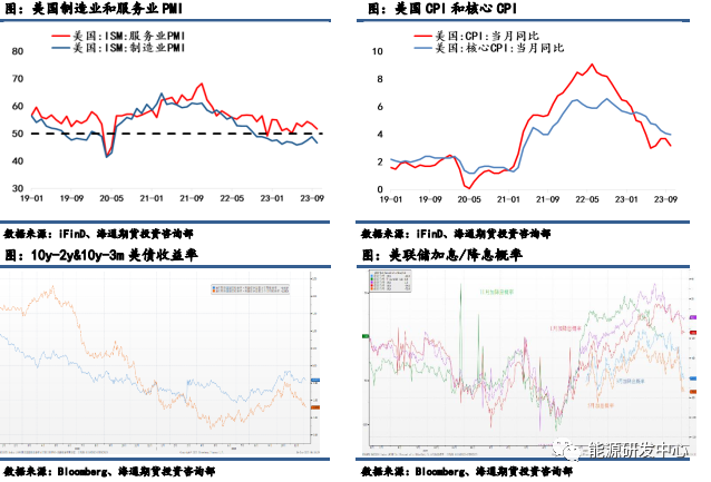 除了风险事件,高利率环境也会给国际油价带来压力。前期油价的高企使商品通胀居高不下,给美国整体通胀带来负反馈,联储为了控通胀从去年开始进入加息周期。自2022年3月至今,美联储已经累积加息11次,联邦基金利率迅速上升525BP至5.25%。美债10年-2年倒挂最深达到108BP创下42年以来历史纪录。在高利率环境下,美国经济表现出了超预期的韧性:虽美国制造业PMI较弱,但服务业PMI基本维持在50上方。所以,市场多次切换炒作美国“经济衰退”预期和“软着陆”预期导致原油市场非基本面因素利空。但从原油的基本面上来看,经济的超预期表现也导致美国油品需求偏强。近期市场又开始预期美联储将在明年降息,但我们认为在高基数效应弱化后,通胀还会有反复,且经济较为强劲的背景下,美联储维持当前高利率环境会较预期更长。