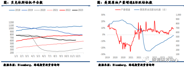 在OPEC+减产的背景下,美国为了控制通胀却做了相反的努力——增产。美国产量增长速度超出了市场预期,在8月美国原油和凝析油产量就升至创纪录的1310万桶/日,超过了2019年11月新冠疫情前创下的1300万桶/日的峰值。美国能源信息署(EIA)数据显示,不包括墨西哥湾水域的本土48州产量增至创纪录的1080万桶/日(10月EIA石油供应月报),其中Permian、Gulf of Mexico和Bakken贡献了较大的增量。与去年同期相比,这48州的产量增加了95.5万桶/日(+10%)。贝克休斯数据显示,11月起当周的未来产量的先行指标--石油和天然气钻机总数已经降至2022年2月以来最低水平。具体来看,石油和天然气钻机总数减少7座至618座,为2022年2月以来最低,较上年同期减少152座或20%。美国石油钻机数量减少8座至496座,为2022年1月以来最低,直至今年12月初也并无大幅增长。