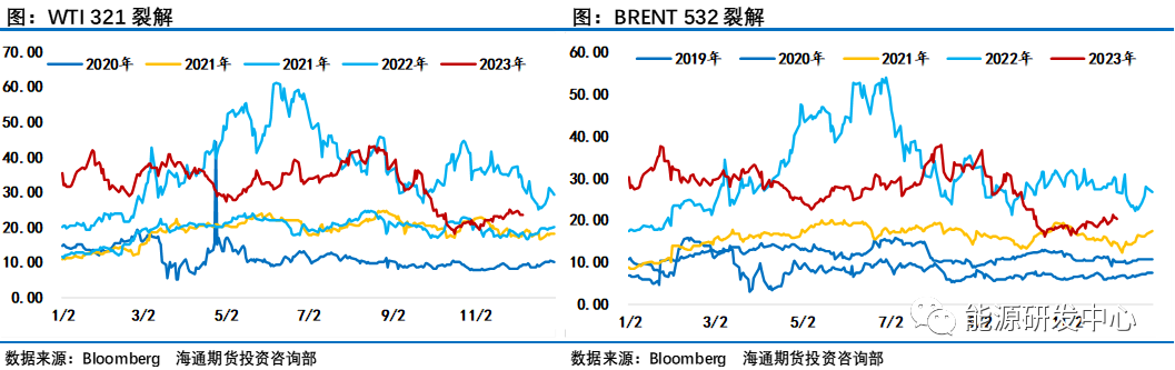值得一提的是2023年原油市场的月间差走势,整个上半年月差波动较为平稳,反应了原油市场供需矛盾不突出,但下半年月差的波动反应了原油市场供需层面的大幅变化,三季度在沙特自愿减产带来供应紧张的推动下油价持续单边上涨,同期原油月间差也持续走高,尤其是9月之后月间差进入了加速冲高阶段,9月底随着库欣库存见底冲到了非常夸张的高度,随后又随着投资者对供需预期担忧升温,月差又迅速回落,即便是10月份巴以冲突爆发刺激了原油绝对价的短线反弹,带来了9美元的地缘溢价,月间差也没有跟随走强,相反月间差坍塌程度比绝对价表现更弱,显示了投资对供需层面从乐观快速转向悲观预期。