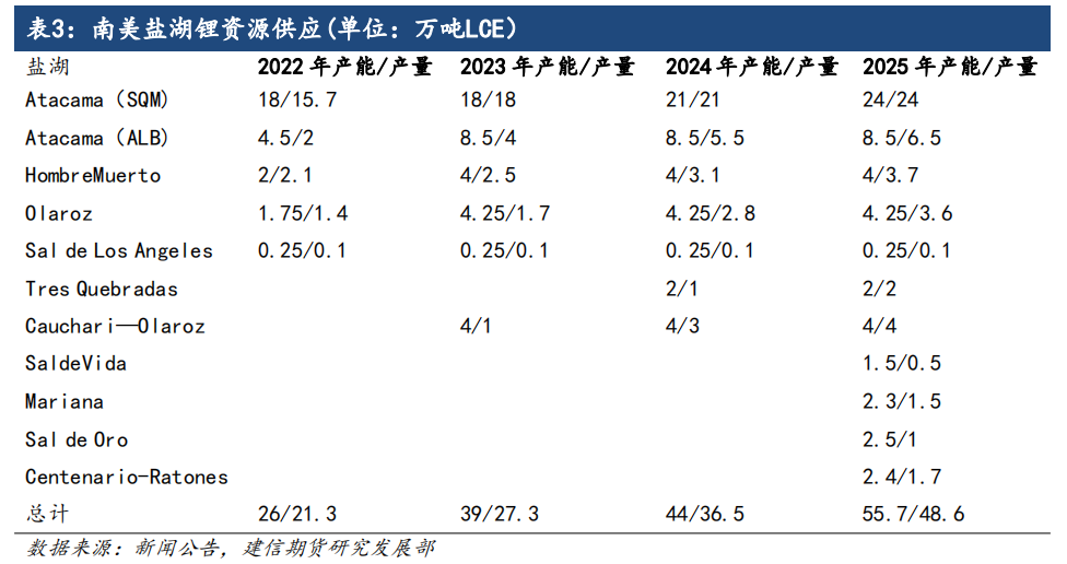南美盐湖项目在2023-2024年迎来集中投产期,目前南美在产盐湖主要分布在智利和阿根廷,智利在产盐湖仅有阿塔卡玛盐湖,Atacama(SQM)扩建工程推迟至2024年底达产;相较于智利盐湖产能大产量集中,阿根廷盐湖相较分散,目前阿根廷在产盐湖4个,Livent的HombreMuerto(Fenix)年底预计完成二期1万吨产能建设;Olaroz盐湖2.5万吨LCE和Cauchari-Olaroz盐湖4万吨LCE均已产出碳酸锂,并将在下半年开始产能爬坡。2023年南美盐湖产能增量13万吨,产量增量6万吨,2024年前期投产产能释放,叠加Atacama(SQM)产能扩产以及紫金3Q盐湖投产,预计2024年产量增量为9.2万吨。