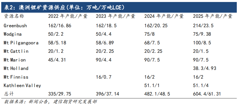 2023年澳洲在产锂矿主要有格林布什矿、沃吉纳矿、P矿、卡特琳矿、马里森矿以及芬尼斯矿,格林布什矿目前正处于产能释放周期,沃吉纳矿计划在2024年产能扩大至75万吨;P矿预计其2024年产能将增加至68万吨;马里森矿在2023年扩产落地后产能扩大至90万吨;2023年在产产能397.3万吨,在2024、2025年分别有凯瑟琳谷项目、芒特霍兰项目投产,叠加在产扩产的产能扩建,预计2024、2025年澳大利亚锂矿产能将分别达到483.4万吨、605.7万吨;预计2023-2025年澳洲锂矿产量分别为39、50、65万吨LCE