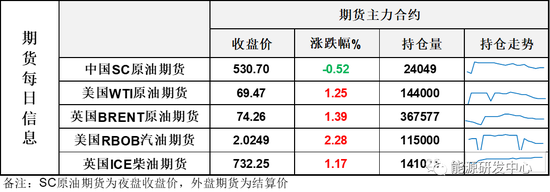 【1】WTI主力原油期货收涨0.86美元,涨幅1.25%,报69.47美元/桶;布伦特主力原油期货收涨1.02美元,涨幅1.39%,报74.26美元/桶;INE原油期货收跌0.52%,报530.7元。