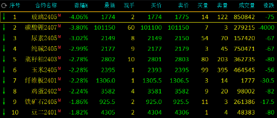早盘收盘,国内期货主力合约跌多涨少,玻璃跌超4%,碳酸锂跌近4%,尿素跌超3%,纯碱、菜粕跌近3%,玉米、鸡蛋跌超2%。涨幅方面,集运指数(欧线)封涨停,涨幅9.99%,纸浆、低硫燃料油(LU)涨超1%。