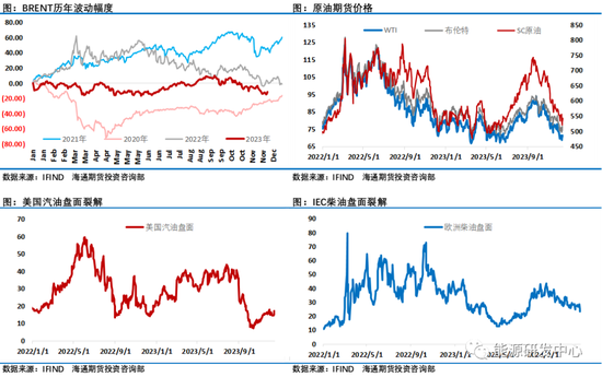 从盘面高频指标来看,近端月差仍处于contango结构且表现较弱,过去几天绝对价反弹同时月差回暖力度相对有限,IEA在刚刚公布的月报中判断宏观经济前景的恶化导致其将今年最后一个季度的石油需求增长预测下调了39万桶/天,这是其将2023年需求增长预测下调9万桶/日的主要原因,需求端在四季度的糟糕表现,这也是过去一段时间油价表现糟糕,且导致投资者对原油市场预期的谨慎的重要原因。不过最近EIA周度数据显示美国汽油、航煤等需求恢复明显,这在一定程度上对市场情绪有所提振。总体来看原油市场供需层面度过了欧佩克+会议之后最为糟糕的阶段,另外美联储及欧洲央行的鸽派言论及降息预期升温,有助于市场情绪回暖,油价在当前区域止跌概率较大,但反弹级别从目前市场局势评估来看会弱于三季度。