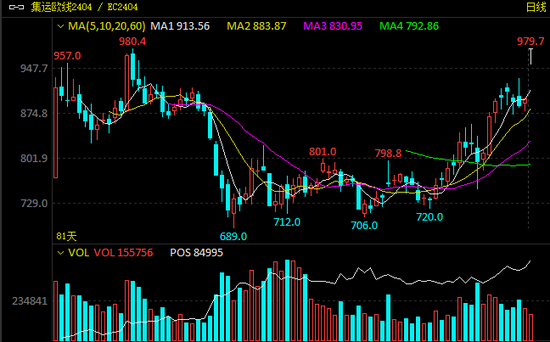 上周末红海及附近海域紧张局势升级,对集运市场形成扰动。本周一,集运指数(欧线)期货主力合约2404开盘涨停,并在午盘前带动所有远月合约全线涨停。截至下午收盘,集运指数(欧线)期货主力合约报收979.7点,涨幅为9.99%。