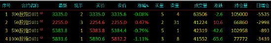 2023年12月18日,股指期货涨跌不一,沪深300股指期货(IF)主力合约跌0.08%,上证50股指期货(IH)主力合约涨0.47%,中证500股指期货(IC)主力合约跌0.78%,中证1000股指期货(IM)主力合约跌1.13%。