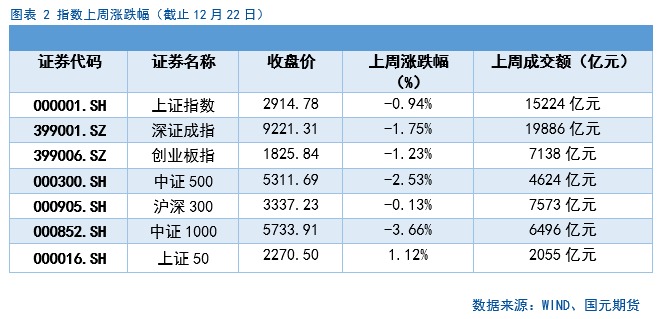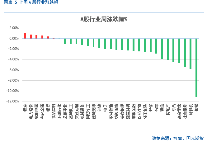 两市周线连续下跌。权重股跌幅相对较小。上证50指数逆势上涨。两市日均成交额为7022亿元,处在今年低位。煤炭,电力设备等板块逆势走高。传媒,计算机等板块跌幅超5%。北向资金净流出超22亿元。