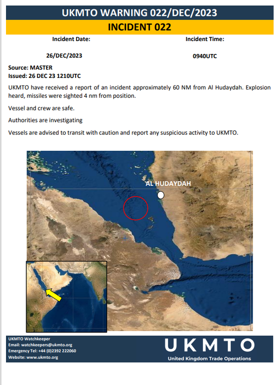 另外,据央视新闻消息,当地时间12月26日晚间,也门胡塞武装发表声明称,在对红海海域“MSC United”号商船三次发出警告遭拒后,胡塞武装向其发射了导弹。