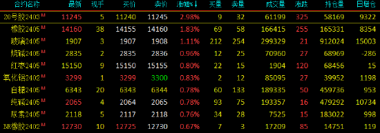 2023年12月29日,早盘开盘,国内期货主力合约涨跌不一。20号胶(NR)涨超3%,橡胶涨近2%,菜粕、玻璃、烧碱涨超1%。跌幅方面,燃料油跌超4%,低硫燃料油(LU)、SC原油、集运指数(欧线)跌超3%,沥青、沪银、苯乙烯跌超1%。