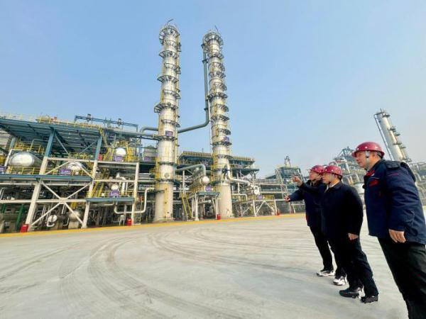 12月28日,目前全球规模最大的乙醇生产装置——60万吨/年乙醇生产装置,在安徽淮北矿业集团碳鑫科技有限公司启动试生产。图为刘中民院士(中)与团队成员在该装置外考察交流。