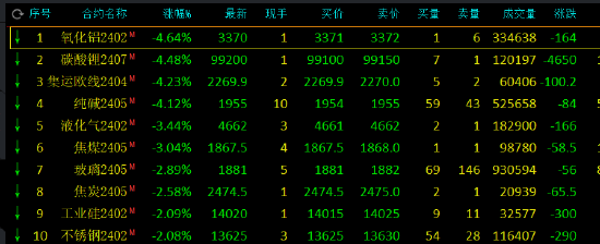 早盘收盘,国内期货主力合约多数下跌。氧化铝、碳酸锂、纯碱、集运指数(欧线)跌超4%,液化石油气(LPG)、焦煤跌超3%,玻璃、焦炭、工业硅、不锈钢(SS)跌超2%。涨幅方面,棕榈油、沪铅涨近1%。