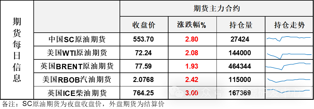 【1】WTI主力原油期货收涨1.47美元,涨幅2.08%,报72.24美元/桶;布伦特主力原油期货收涨1.47美元,涨幅1.93%,报77.59美元/桶;INE原油期货收涨2.8%,报553.7元。