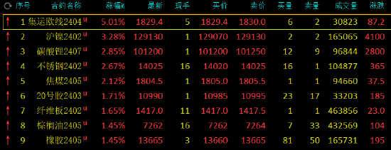 早盘收盘,国内期货主力合约涨跌不一,集运指数(欧线)涨超5%,沪镍涨超3%,碳酸锂、不锈钢(SS)涨近3%,焦煤涨超2%。跌幅方面,液化石油气(LPG)、玻璃跌超2%,菜粕跌近2%。