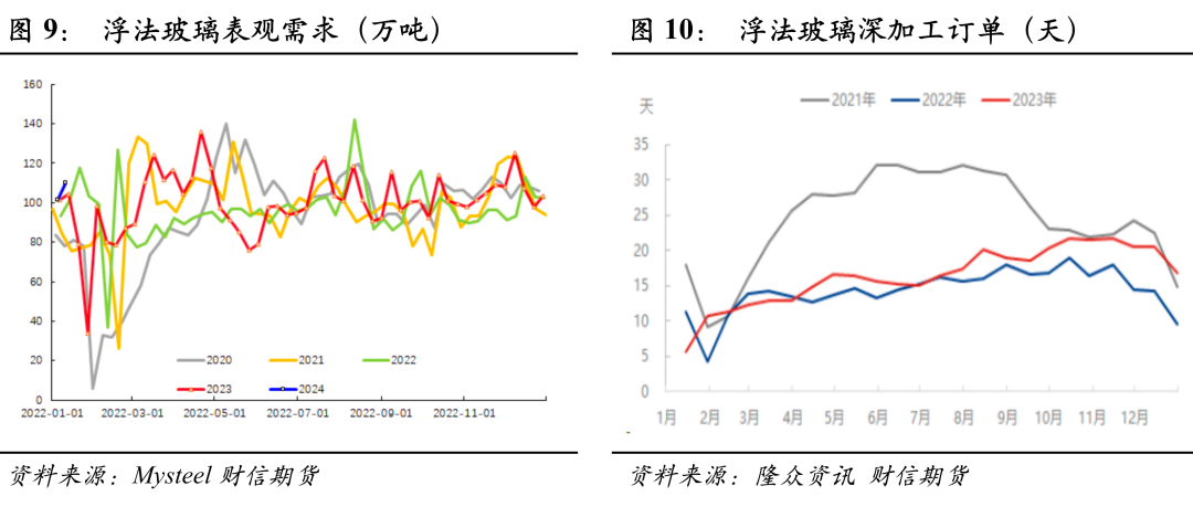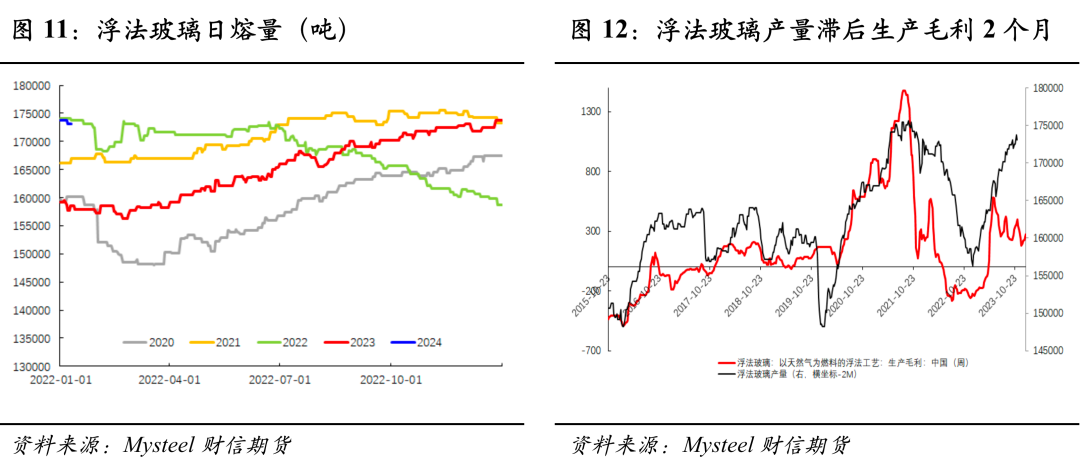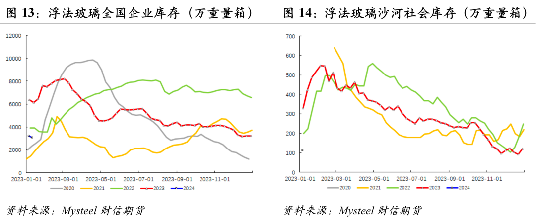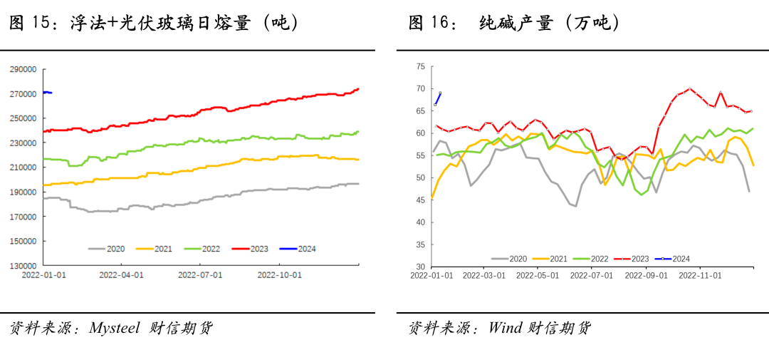 政策方面, 政治局会议针对明年强调“以进促稳、先立后破”,财政政策提到要“适度加力、提质增效”。中央经济工作会议强调稳妥化解房地产风险,一视同仁满足不同所有制房地产企业的合理融资需求,加快推进保障性住房建设、“平急两用”公共基础设施建设、城中村改造等“三大工程”完善相关基础性制度。如我们年报中所述,这对竣工端建材需求提振相对有限,我们预估2024年资金端对竣工需求的拉动脉冲式,整体或前高后低,而浮法玻璃供给端将继续高位运行,玻璃格局或逐步转变,中期玻璃05在1900-2000元/吨一线面临较大的压力。