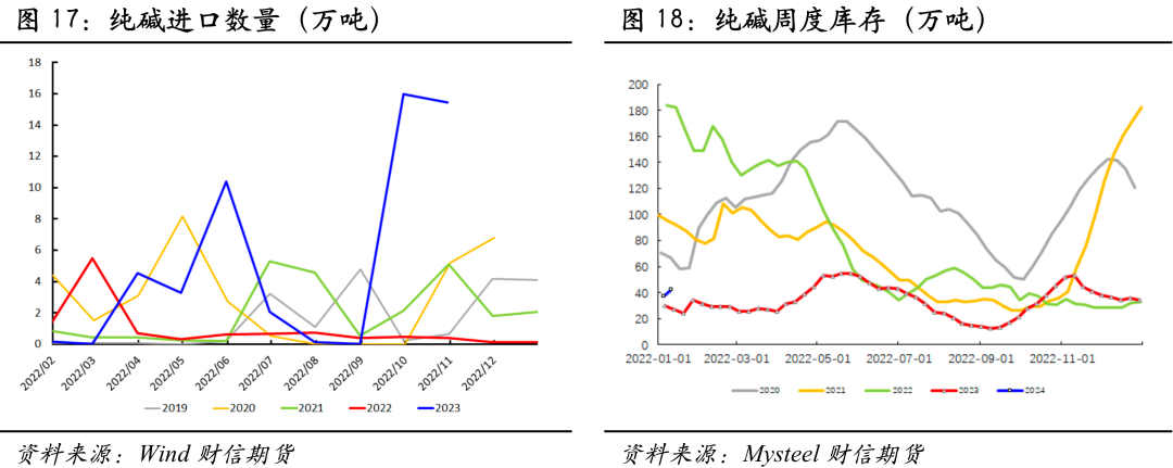 本周,纯碱厂家总库存存42.59万吨,环比增加5.63万吨。其中,轻质库存24.99万吨,重质库存17.60万吨。据浮法+光伏最新的日熔量数据27.07万吨,周刚需耗碱37.9万吨,当前重碱略产大于销,供需双强。目前样本玻璃厂库存天数14.3天,偏低但并不极端,加上物流不及前两年受阻,投机氛围较弱,库存发生累积。