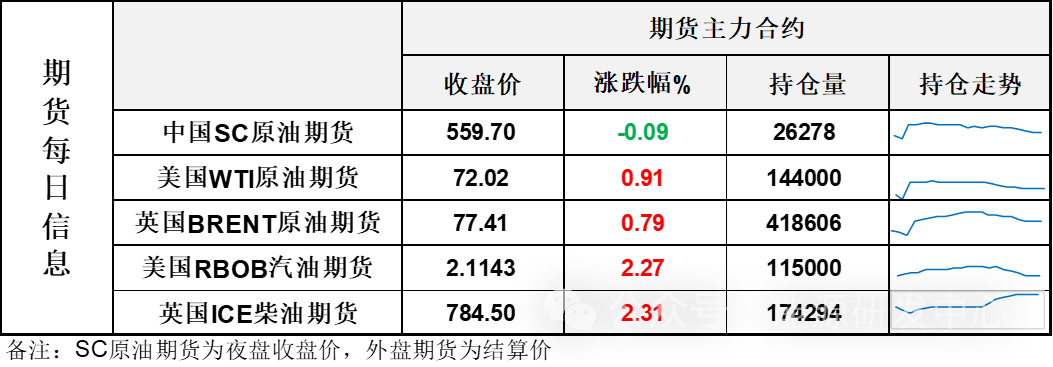 【1】WTI主力原油期货收涨0.65美元,涨幅0.91%,报72.02美元/桶;布伦特主力原油期货收涨0.61美元,涨幅0.79%,报77.41美元/桶;INE原油期货收跌0.09%,报559.7元。