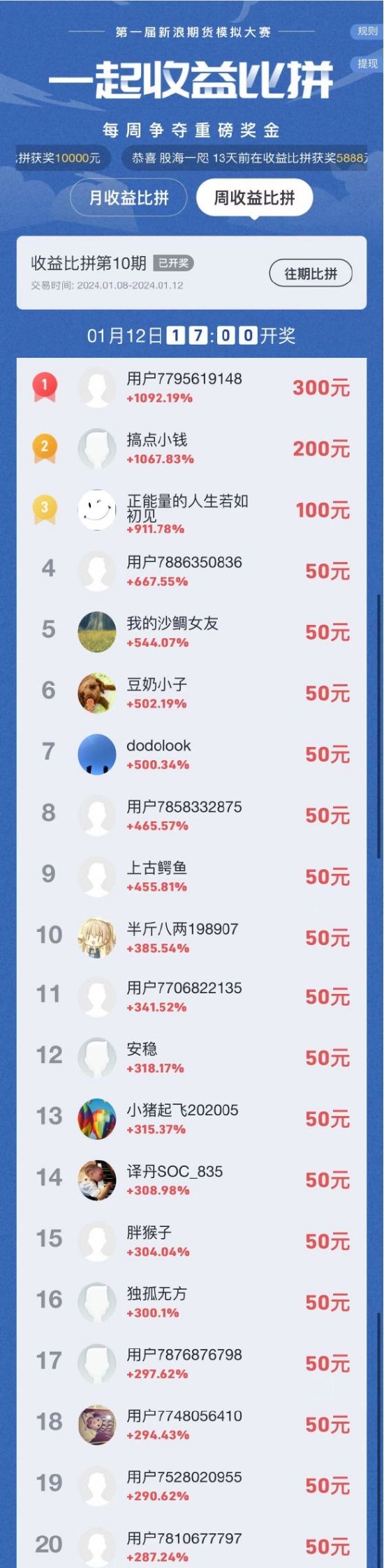 “第一届新浪期货模拟大赛”周赛第十期已结束,本周大赛参与者收益率波动明显增大,第一名“用户7795619148”通过对集运指数的精准多空操作成功实现周内超10倍收益,而单周收益率超300%的达16位参与者。