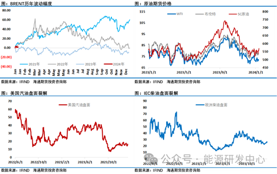 但冲高之后油价并未守住涨幅,这意味着现阶段投资者对油价后市预期并未形成一致观点,多空双方各执一端,这直接导致了油价在新年之后上演了连续拉锯战。一方面对于欧佩克+一季度减产行动效果仍需时间验证,欧佩克+核心减产国均发表了积极言论试图提振市场信心, EIA短期能源展望中判断欧佩克+减产将导致2024年第一季度全球石油库存平均减少80万桶/日,虽然从理性角度判断从欧佩克+各核心减产国的表态看会遵守自愿减产以护盘油价,投资者对此有预期,但押注时表现谨慎,信心并不足;而近期地缘因素有升温迹象给油价注入了溢价,也在一定程度上改善了市场情绪,但总体来看当前原油市场局势仍然让投资者保持了克制,对于追涨操作仍然谨慎,布伦特冲上80美元之后,缺乏追涨意愿让油价难以守住涨幅,油价最终还是退回到多空相持状态。