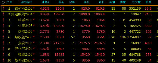 早盘收盘,国内期货主力合约有涨有跌。铁矿石涨超4%,焦煤、集运指数(欧线)、纯碱涨超3%,热卷、螺纹钢、焦炭涨超2%。跌幅方面,丁二烯橡胶(BR)、玉米跌超1%。