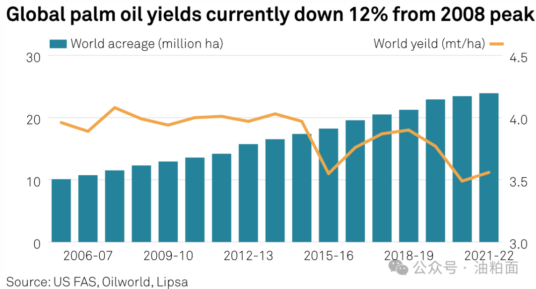 虽然每公顷油棕的产量是大豆、向日葵或油菜籽等其他主要油籽的许多倍,但油棕树的产量高峰期在9-18岁之间。在此之后,单产开始下降,老树必须被替换。