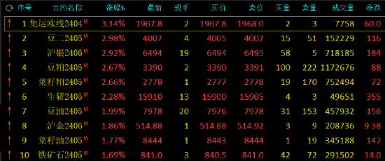 早盘收盘,国内期货主力合约涨跌互现。集运指数(欧线)涨超3%,豆二、沪银涨近3%,豆粕、菜粕、生猪涨超2%,豆油、沪金涨近2%。跌幅方面,PX0>对二甲苯(PX)、PTA跌超2%,丁二烯橡胶(BR)、短纤、低硫燃料油(LU)、橡胶、液化石油气(LPG)、甲醇跌超1%。