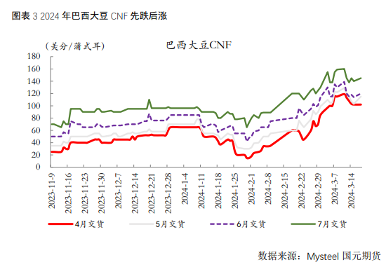 3月以来,在美豆低位运行的同时,巴西大豆升贴水呈现持续上涨态势,不过最近一周出现了见顶趋势,呈现高位小幅回落。截至3月18日,巴西大豆4月、5月、6月、7月船期CNF升贴水报价分别为102、115、120、145美分/蒲,较前日稳中有涨,低于上周同期。当前市场各机构对巴西大豆新作产量仍在向下调整,巴西国家商品供应公司(CONAB)发布 3 月份预 测报告,将 2023/24 年度巴西大豆产量预期调低至 1.4686 亿吨,较上月预测的 1.494 亿吨低了 254 万吨,其它咨询机构给出的产量预期整体在1.4-1.57亿吨之间,在南美其它大豆主产国维持增产预期之下,南美丰产的基调仍存。巴西大豆仍存在较强的卖压,后续或施压巴西升贴水。目前巴西大豆已收获近半,阿根廷大豆也将开始集中收获,二季度南美大豆出口压力凸显,将打压后期价格走势,关注后期南美大豆上市及出口进度。