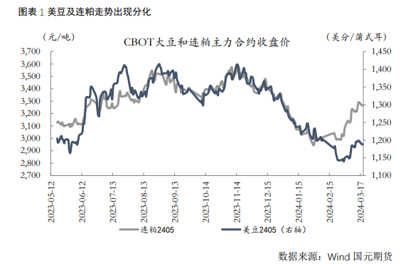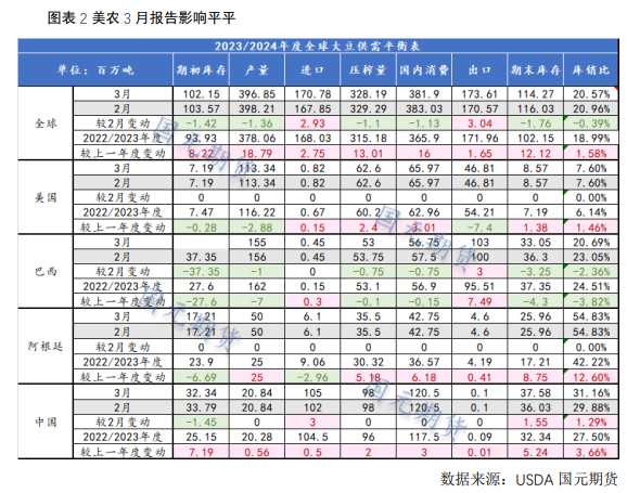 本月中美国农业部(USDA)3月份供需报告并未给市场以明确方向指引,整体仍维持全球大豆供应宽松的预期。报告维持2023/24年度美国、阿根廷大豆供需数据不变,小幅下调巴西大豆产量100万吨至1.55亿吨、上调出口量300万吨至1.03亿吨、下调期末库存325万吨至3305万吨,报告仍维持全球大豆大幅增产的观点。预计2023/24年度全球大豆产量3.9685亿吨,比上年度增加1879万吨同比增长5.0%,其中南美四国(巴西、阿根廷、巴拉圭和乌拉圭)大豆总产2.182亿吨,较上年度增加2045万吨。
