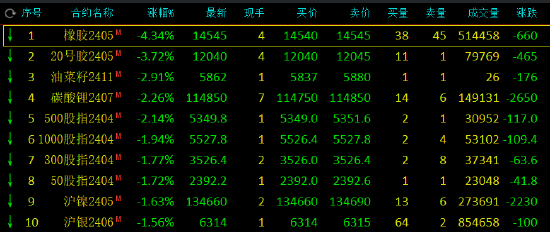 早盘收盘,国内期货主力合约多数下跌。橡胶跌超4%,20号胶(NR)跌超3%,碳酸锂跌超2%,沪镍、沪银、豆粕、丁二烯橡胶(BR)、聚氯乙烯(PVC)、豆二、SC原油、菜粕、生猪跌超1%。涨幅方面,焦煤涨超1%。