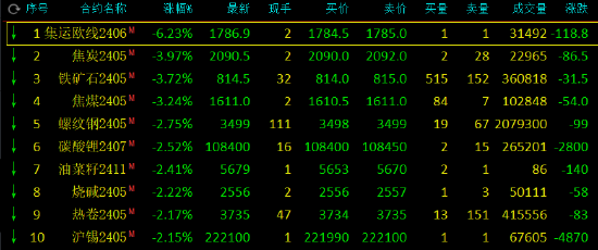 午盘收盘,国内期货主力合约多数下跌,集运指数跌超6%,焦炭、焦煤、铁矿石跌超3%,螺纹钢、烧碱、沪锡、热卷、沪镍、碳酸锂跌超2%;涨幅方面,红枣涨超2%,尿素、燃料油涨超1%。
