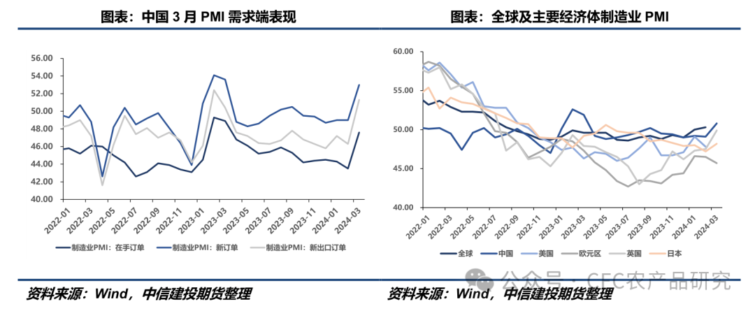 基于此,我们认为要理解改善动能源自何处,可能还是要把视角切换至海外。从国内对海外出口的数据来看,利好集中在化工、纺织和汽车三个行业上。这三个行业出口好转一方面与海外需求挂钩,一方面也是因为国内价格较海外更低。进一步的讨论是海外需求未来能否成为国内出口项表现亮眼的持续动能。我们对此可能会偏乐观看待,毕竟越来越多的经济数据在表征着市场在2023年年末做出的对于2024年全球经济面临衰退的预期在边际上是有所改善的:2024年1-2月全球制造PMI显著回升,美国制造业PMI也没有再向着更低位置去下跌。全球制造业景气度复苏带动中国基础原材料出口,这一路径有望从最开始中国商品有价格优势向着全球其他国家或区域制造业复苏引致出中国需求放量做转变。因此我们理解3月制造业PMI回暖对于国内经济预期有着较强的修复意义,资产价格变化有望在国债尤其是长端有所体现。