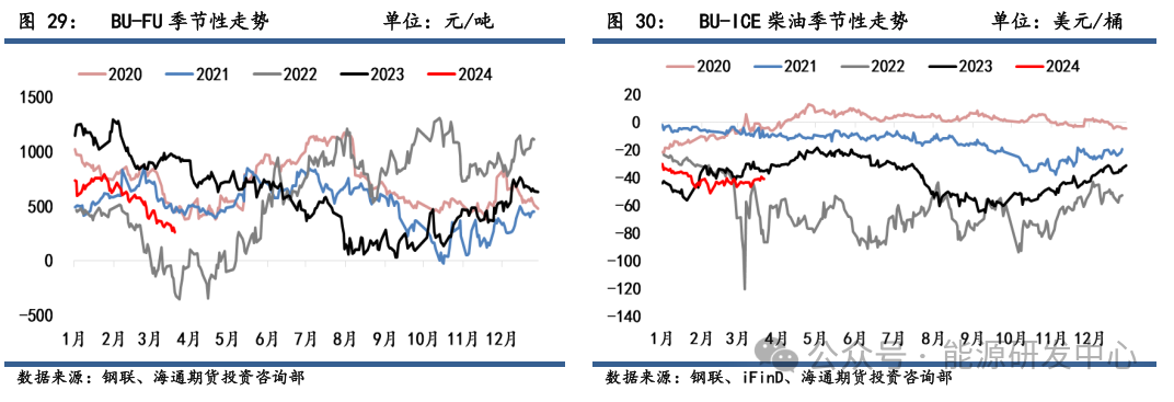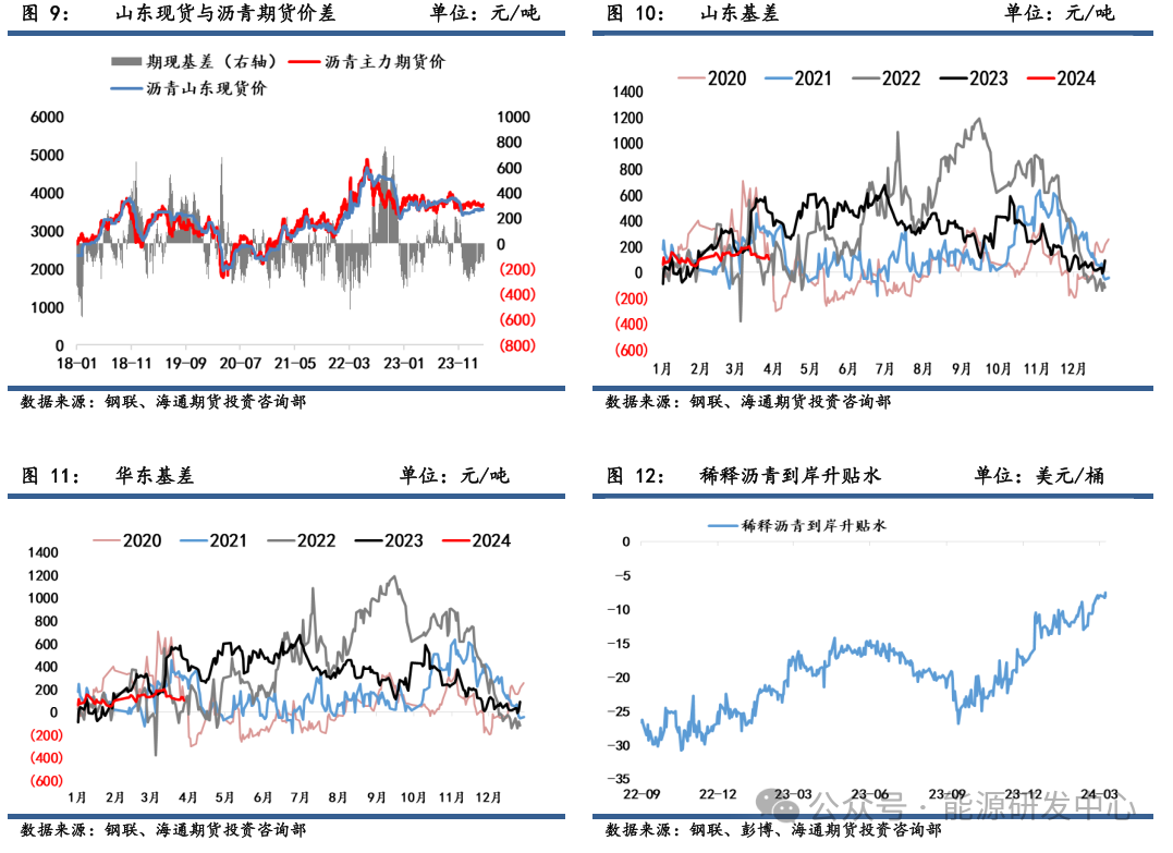 本周山东现货与沥青期货基差窄幅震荡。沥青期价继续上涨,现货价格弱势维稳,基差窄幅震荡。截止3月29日,山东期现基差录得-136元/吨,环比3月22日-121元/吨跌幅扩大;华东期现基差录得104元/吨,环比3月22日114元/吨回落,基本弱于去年同期阶段水平。3月28日,稀释沥青到岸升贴水为-8美元/桶,环比3月22日-7.97美元/桶基本持平,原料端成本端坚挺也使得沥青价格跌幅受限。