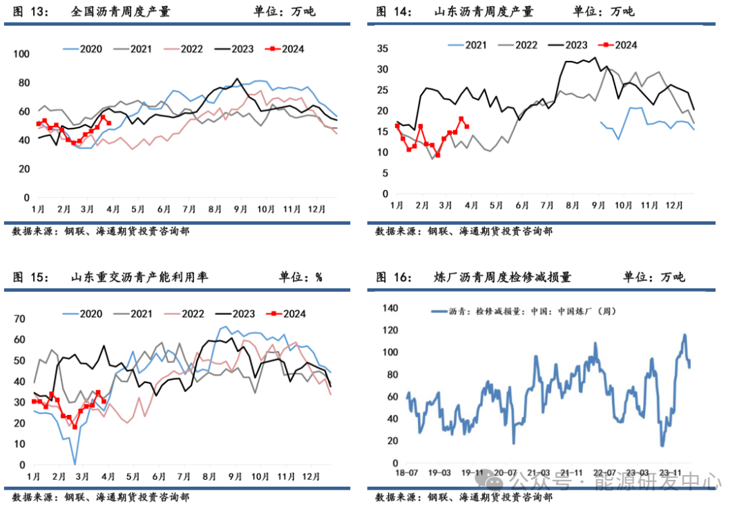 本周国内沥青总体产量下滑。3月29日当周,中国沥青产量为51.8万吨,环比3月22日当周56万吨回落8%。其中华东产量为11.45万吨,环比3月22日当周12.85万吨回落11%。山东沥青产量为16.12万吨,环比3月22日当周18.08吨回落11%;重交沥青产能利用率为30.4%,环比3月22日当周34.8%回落。本周国内炼厂沥青检修减损量为92.76万吨,环比上周86.18万吨上涨7%。在整体需求疲弱下,炼厂开工积极性仍相对不高,沥青供应压力有限,支撑沥青价格底部。