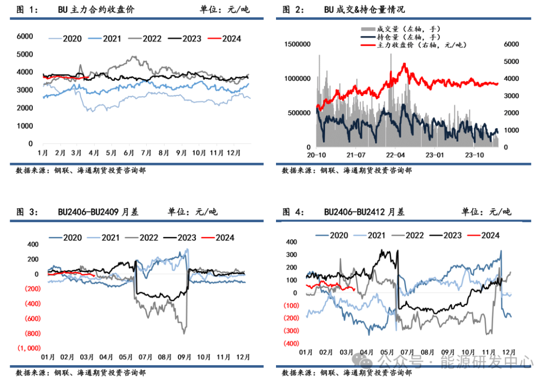 本周沥青期货价格震荡偏强。原油价格走强带动沥青盘面被动上涨,但现货需求平淡和累库趋势尚未缓解,自身基本面带来的上方空间不足;而在低开工率和成本端坚挺支撑下,价格下探空间也相对有限,短期维持区间震荡看待,关注原油价格驱动。截止3月29日,沥青主力合约收于3716元/吨,环比3月25日上涨10元/吨,涨幅0.3%;单边成交量110924手,环比減少15743手;持仓量202181手,环比减少3586手。价差结构上,BU2406-2409价差为-22元/吨,环比3月22日-5元/吨跌幅扩大;BU2406-2412价差为28元/吨,环比3月22日42元/吨回落。