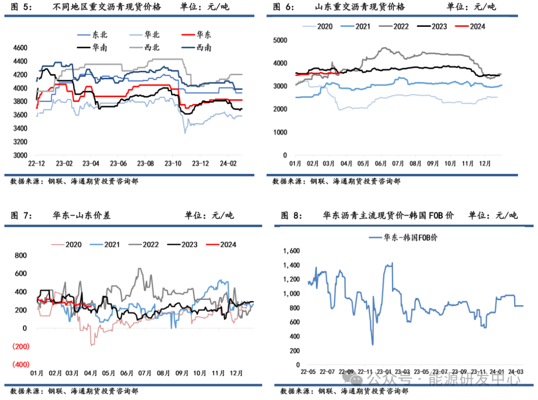 本周现货价格维持稳定。截止3月29日,山东重交沥青现货价为3580元/吨,环比3月22日3585元/吨跌幅0.1%。其中除华南市场涨幅5元/吨外,其余市场基本稳定。华东-山东价差为240元/吨,环比3月22日235元/吨稳定增加;华东-韩国FOB价差为826元/吨,环比3月22日824元/吨稳定增加。天气回暖带动需求稍许增加,但由于社会库存持续累积,现货货源基本以低价货为主。需求淡季下,下游项目开工不及预期,终端资金回笼速度慢,贸易商仍以按需采购为主,整体出货表现仍相对清淡。