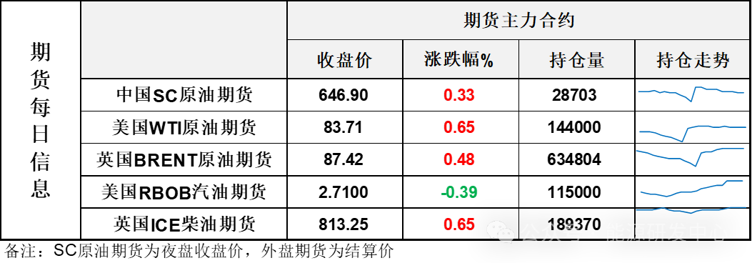 【1】WTI主力原油期货收涨0.54美元,涨幅0.65%,报83.71美元/桶;布伦特主力原油期货收涨0.42美元,涨幅0.48%,报87.42美元/桶;INE原油期货收涨0.33%,报646.9元。