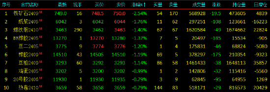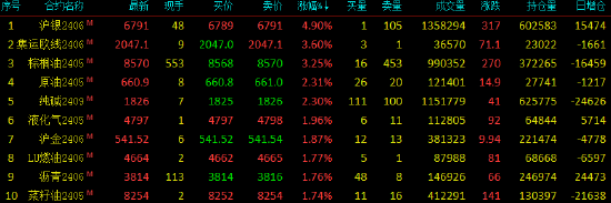 2024年4月3日,期市收盘,国内期货主力合约互有涨跌。沪银涨近5%,集运指数(欧线)、棕榈油涨超3%,纯碱、SC原油涨超2%,液化石油气(LPG)、沪金涨近2%。跌幅方面,铁矿石跌超2%,纸浆、螺纹钢、橡胶、丁二烯橡胶(BR)、豆二、豆粕跌超1%。