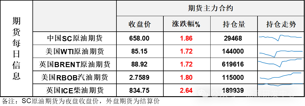 【1】WTI主力原油期货收涨1.44美元,涨幅1.72%,报85.15美元/桶;布伦特主力原油期货收涨1.5美元,涨幅1.72%,报88.92美元/桶;INE原油期货收涨1.86%,报658元。